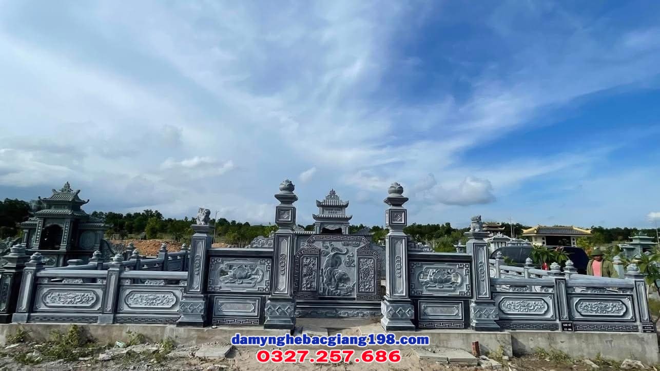 Tường bao được thiết kế để định hình khuôn viên rõ ràng và tạo sự bảo vệ. Chất liệu thường dùng là đá xanh, đá trắng, hoặc đá vàng tự nhiên với chạm khắc hoa văn rồng, phượng, sen. Cổng vào thường được điêu khắc công phu, thể hiện sự bề thế, uy nghiêm.