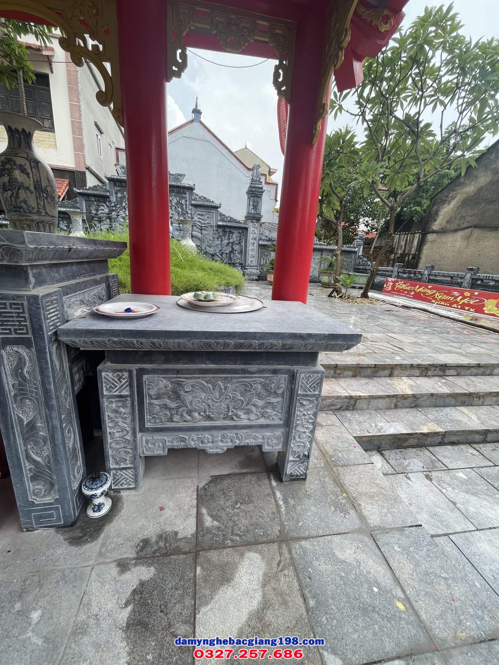 Bàn lễ đá được chế tác từ đá tự nhiên nguyên khối, thiết kế vững chắc, chạm khắc hoa văn tinh xảo, chuyên dùng trong khu lăng mộ, nhà thờ họ, đình chùa và công trình tâm linh. Sản phẩm có độ bền cao, chịu được thời tiết khắc nghiệt, mang ý nghĩa trang nghiêm và thể hiện lòng thành kính trong thờ tự.
