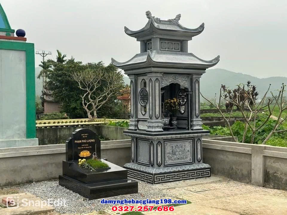 Lăng thờ đơn 2 mái đá xanh đen là hạng mục trung tâm trong nhiều khu lăng mộ gia đình. Với thiết kế hai tầng mái truyền thống, mẫu lăng này mang nét kiến trúc cổ kính, hài hòa và đậm giá trị tâm linh.