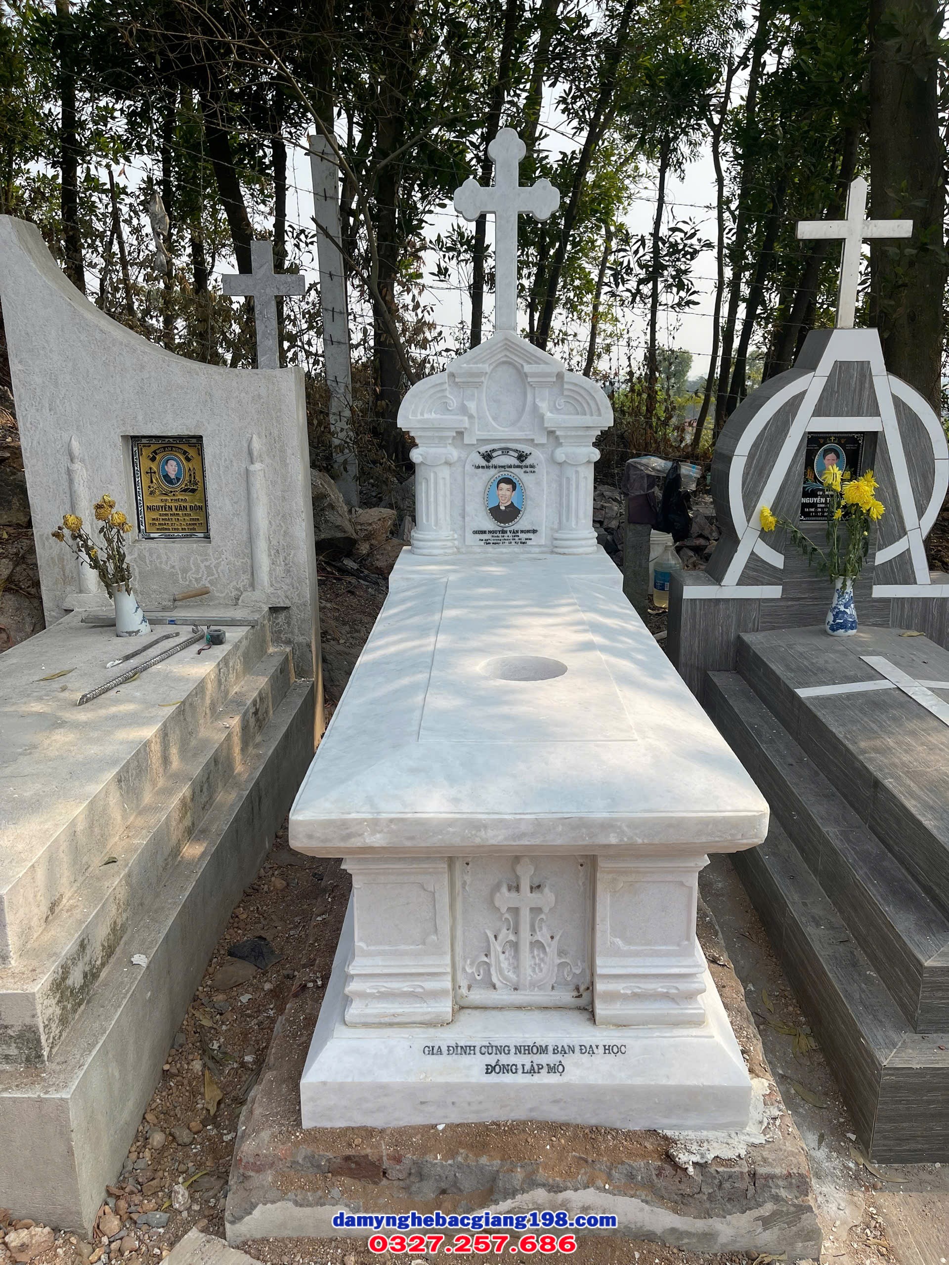 Mộ đá được xây dựng chắc chắn, trang nghiêm, thể hiện mong muốn người đã khuất được yên nghỉ trong sự che chở thiêng liêng.